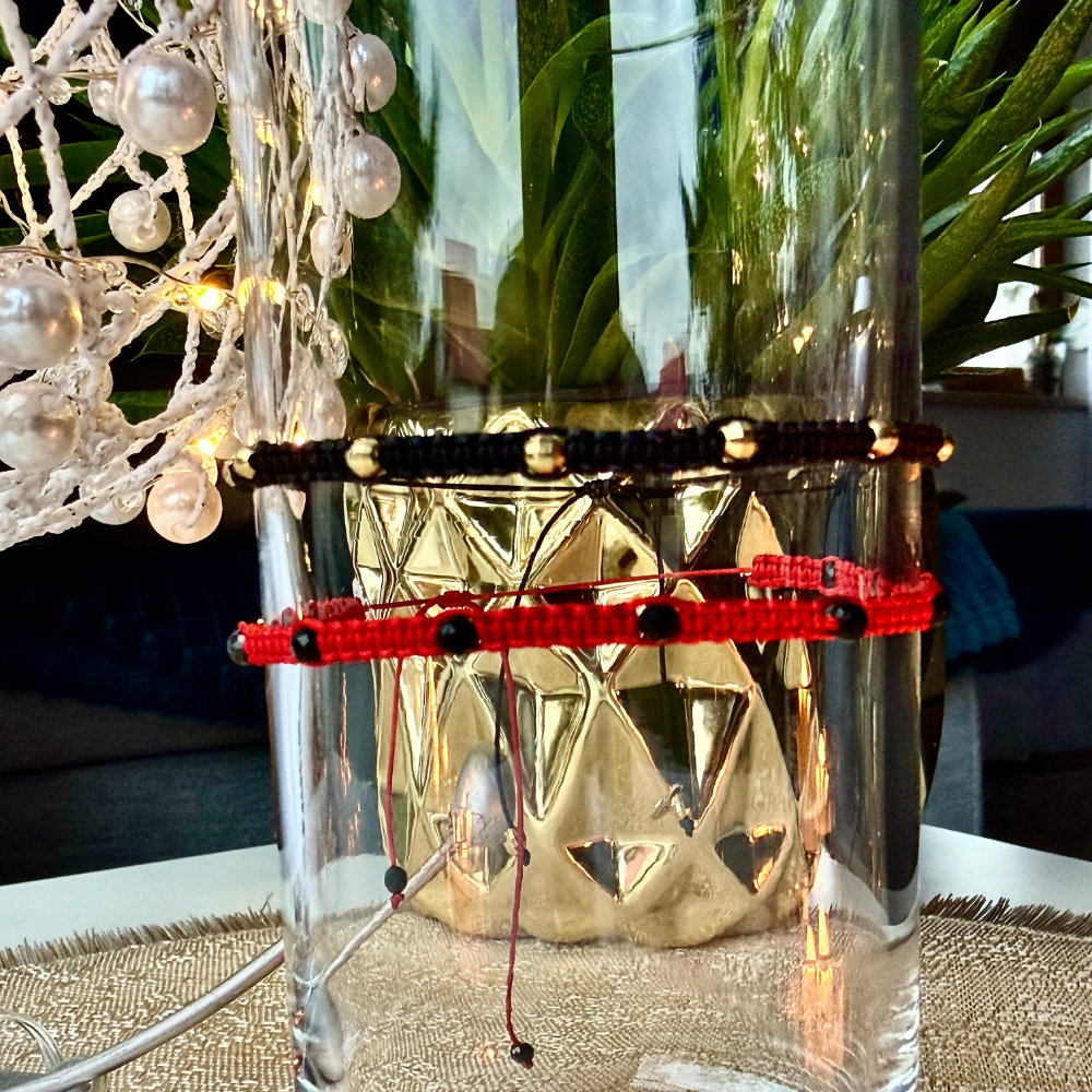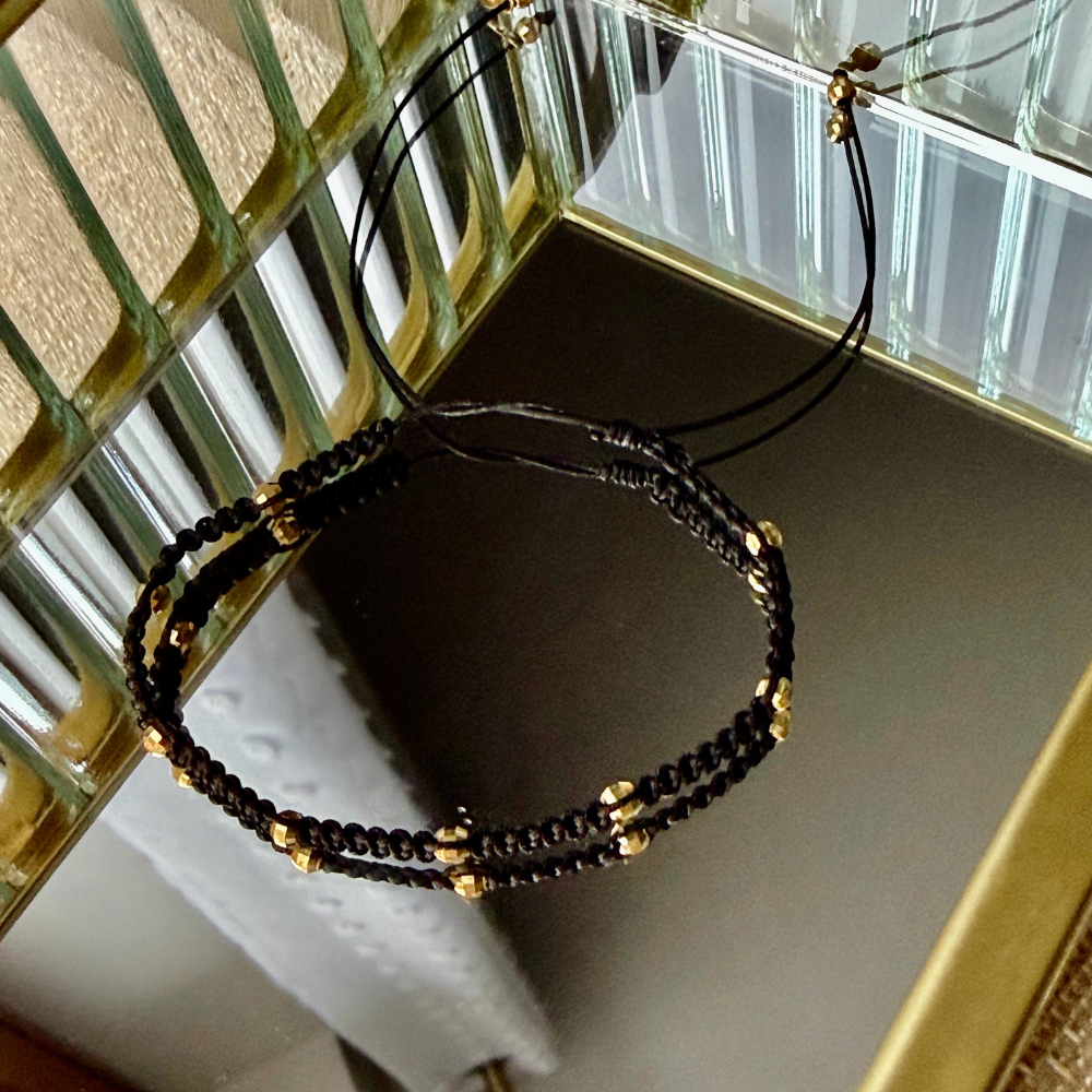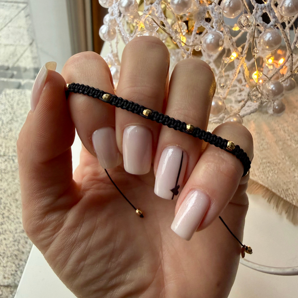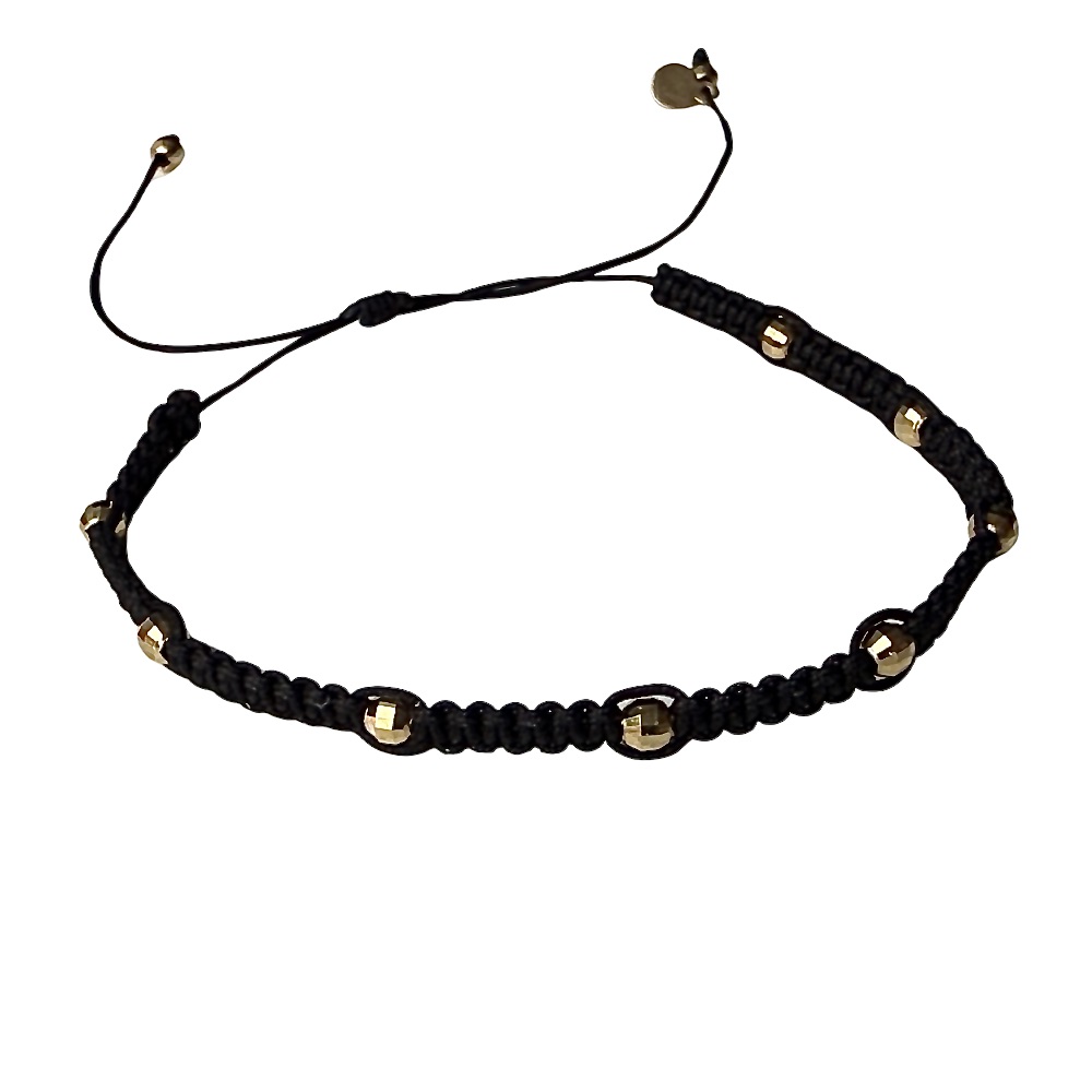 Bransoletka Makrama Black to uniwersalny i stylowy dodatek wykonany z trwałego, woskowanego sznurka nylonowego w głębokim, czarnym kolorze oraz fasetowanych koralików w kolorze złotym. Precyzyjny splot makramy zapewnia ponadczasowy charakter, a regulowane zapięcie umożliwia idealne dopasowanie bransoletki do każdego nadgarstka.