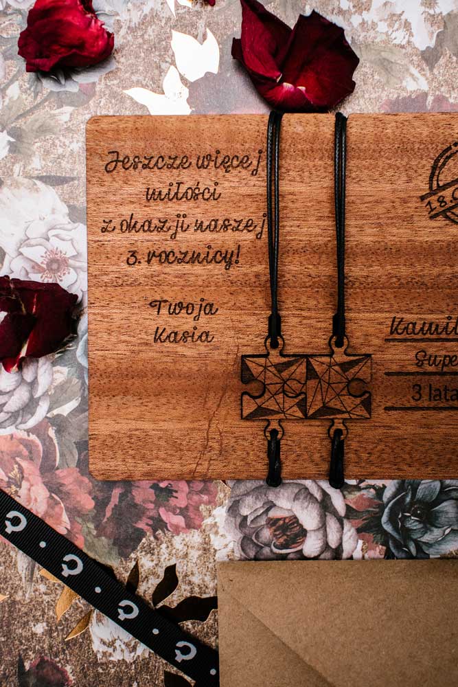 Oryginalny prezent na ślub lub rocznicę? Mamy to! Podaruj wyjątkową drewnianą kartkę z własnymi życzeniami, dowolną datą i… dwiema bransoletkami w zestawie! Całość zapakowana w kopertę z szarego papieru i przewiązana elegancką wstążką – gotowa do wręczenia.